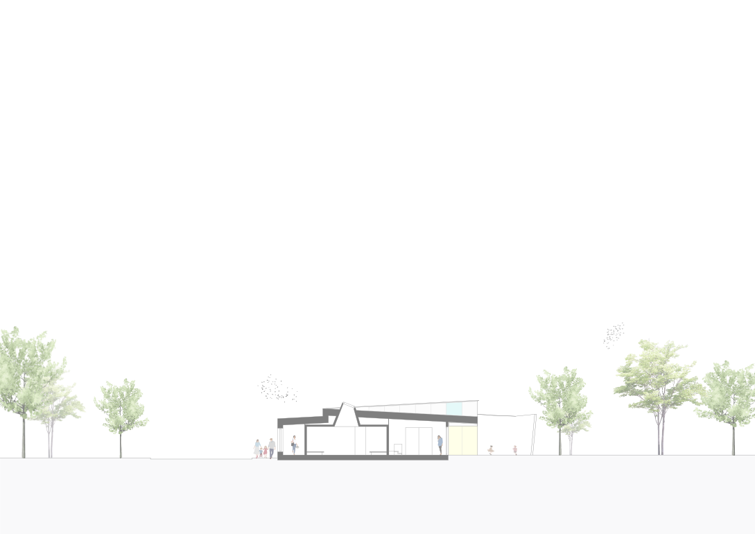 Neben dem Kindergarten entsteht ein Anbau für eine Krippengruppe inkl. Spielbereich, eine Verteilerküche und ein Speiseraum für den bestehenden zweigruppigen Kindergarten. Der Entwurf folgt dem natürlichen Geländeverlauf, sodass sich ein direkter Gartenzugang ergibt.