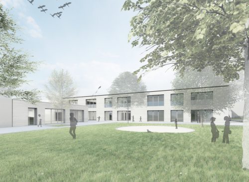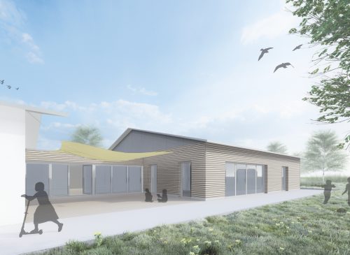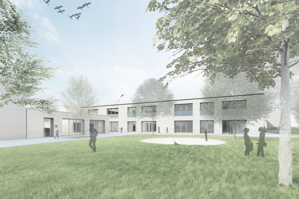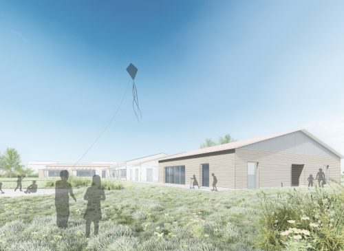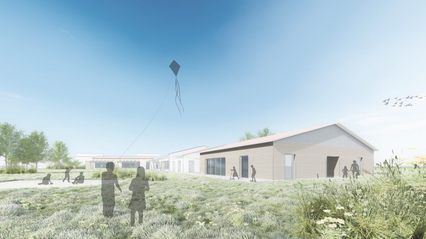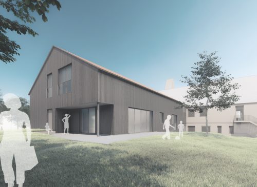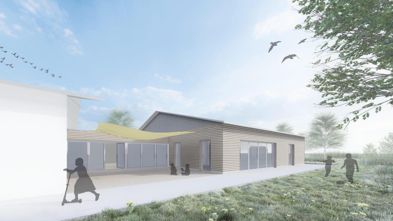 Für zwei Krippengruppen und eine Kindergartengruppe entsteht ein neuer Kindergarten im dörflichen Umfeld. Das Gebäude umschließt einen großen, mittig gelegenen Spielbereich, der für alle Kinder direkt von den Gruppenräumen aus erreichbar ist. Ein zweiter Bauabschnitt für zwei weitere Gruppen ist als Aufstockung mit großzügiger Spielterrasse im Obergeschoss geplant.
