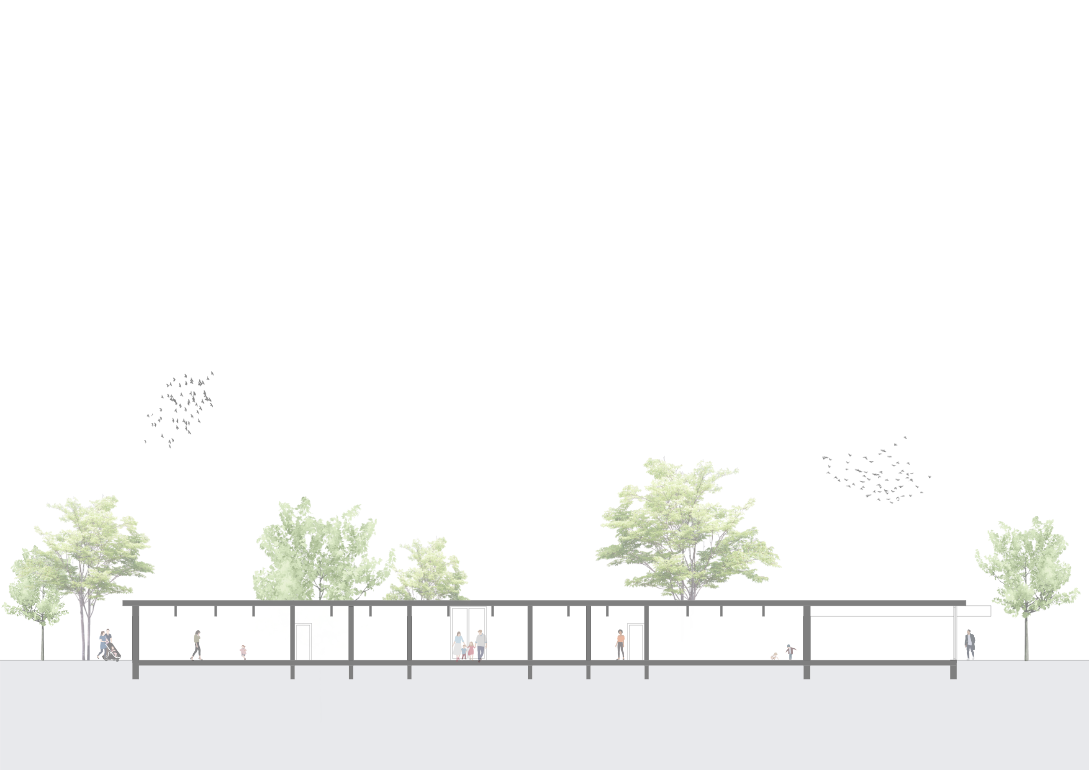Der zweigeschossige Neubau für sieben Kindergartengruppen wird an die bestehende Kinderkrippe in Holzbauweise angebaut und ersetzt die Bestandsbauten aus den 70er Jahren. Der Entwurf verbindet die Krippe und Kindergarten mit einem gemeinsamen Speiseraum sowie einer bespielbaren Dachterrasse. Der Neubau orientiert sich eng an der östlichen Grundstücksgrenze und vergrößert so die westlich gelegenen Spielflächen.